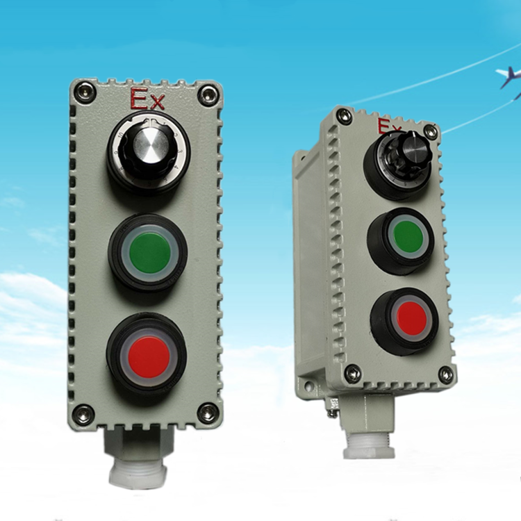 防爆按鈕盒廠家直銷,上圖為一個(gè)防爆電位器,兩個(gè)防爆帶燈按鈕。